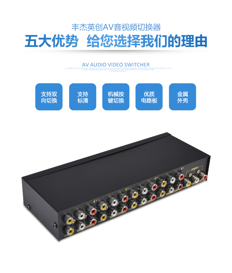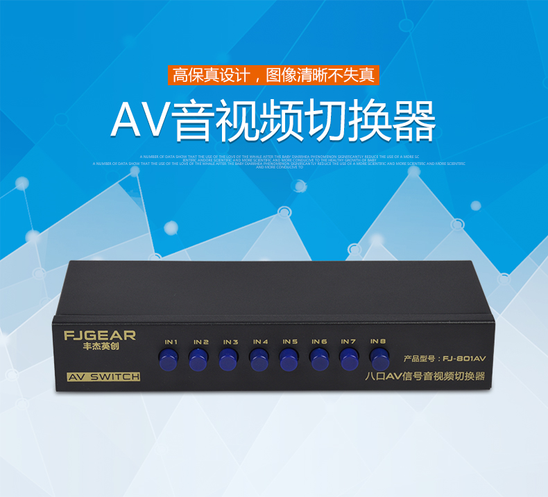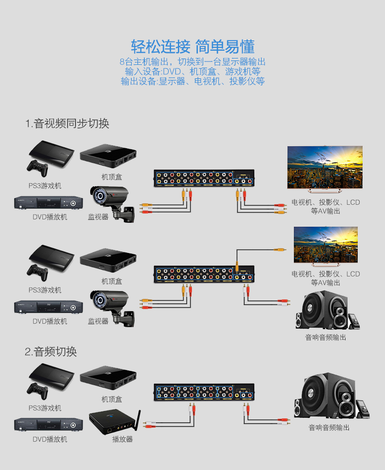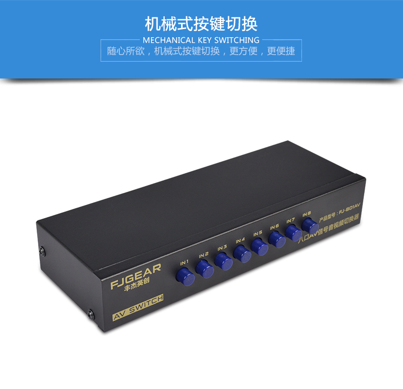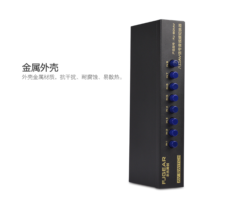 1、8路AV信號輸入,切換1路AV信號輸出;
